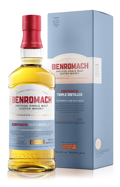 An interesting view of a typically heavier Speyside dram, this expression from Benromach has been triple distilled, a style very rarely seen in Scotch Whisky. Matured entirely in ex-bourbon casks filled in 2011, the nose offers a basket of tropical fruits, with fresh vanilla pods and baked biscuits. The palate brings a trip to the orchard, with ripe green apples and pears in the spotlight, backed by touches of banana and clover honey. Soft smoke and citrus leave you wanting more...
