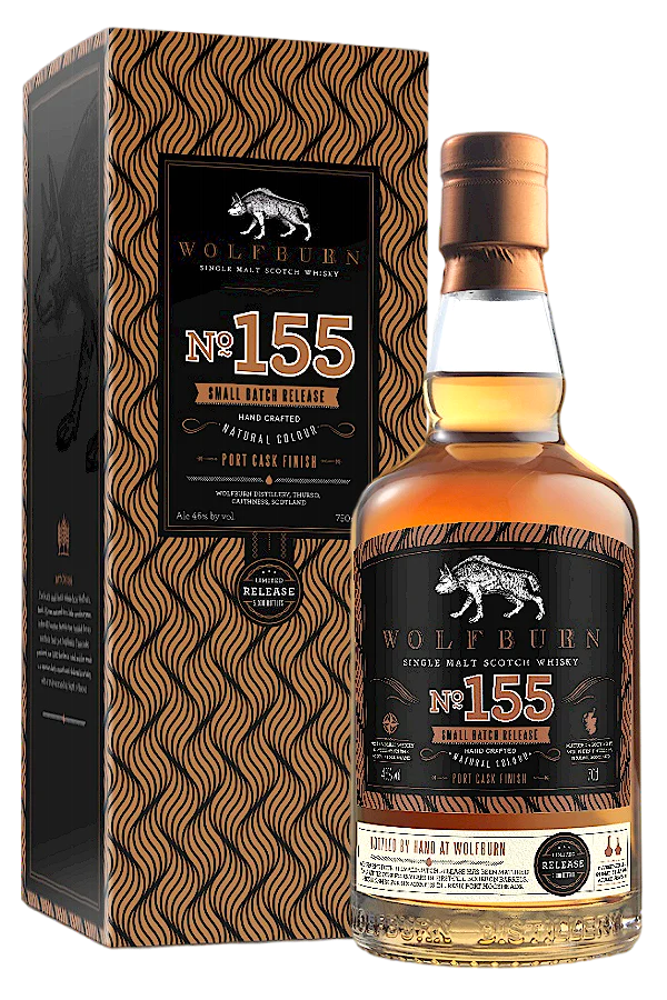 Wolfburn Distillery's fourth small-batch release, named Batch 155. Consisting of just 5300 bottles in total, it is the first whisky from Wolfburn to have been matured in one type of cask (first-fill ex-bourbon barrels for close to five years) then finished in another (six months in port hogsheads).